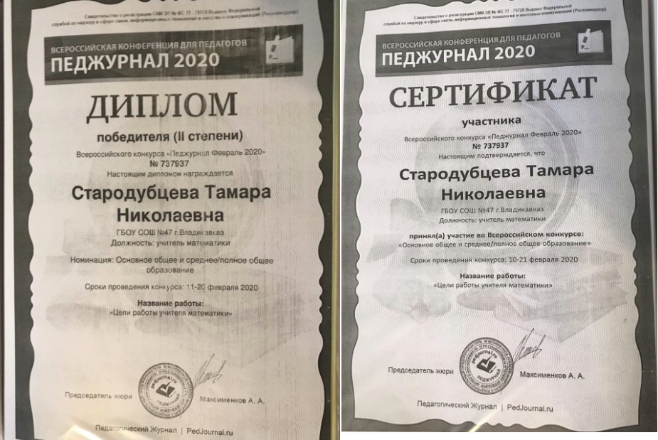 В феврале 2020 года учитель математики высшей категории Стародубцева Тамара Николаевна стала победителем Всероссийского конкурса "Педжурнал Февраль 2020" и получила Диплом победителя II степени! Поздравляем Вас, Тамара Николаевна! Новых творческих успехов и достижений в Вашем нелёгком труде!