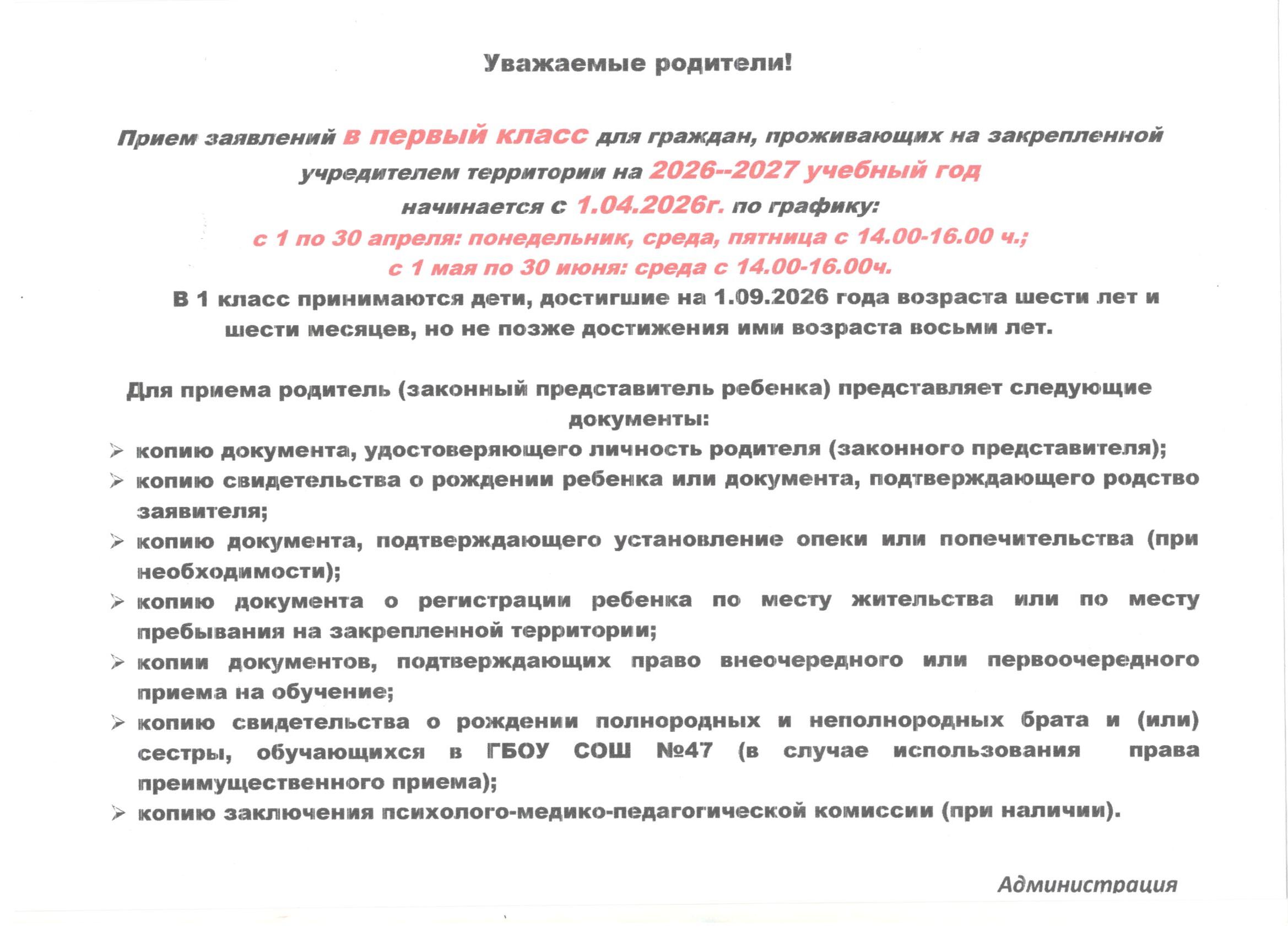 Принимаются в первые классы дети в возрасте от 6,5 до 8 лет. По заявлению родителей учредитель образовательной организации может разрешить приём ребёнка в более раннем или более позднем возрасте.